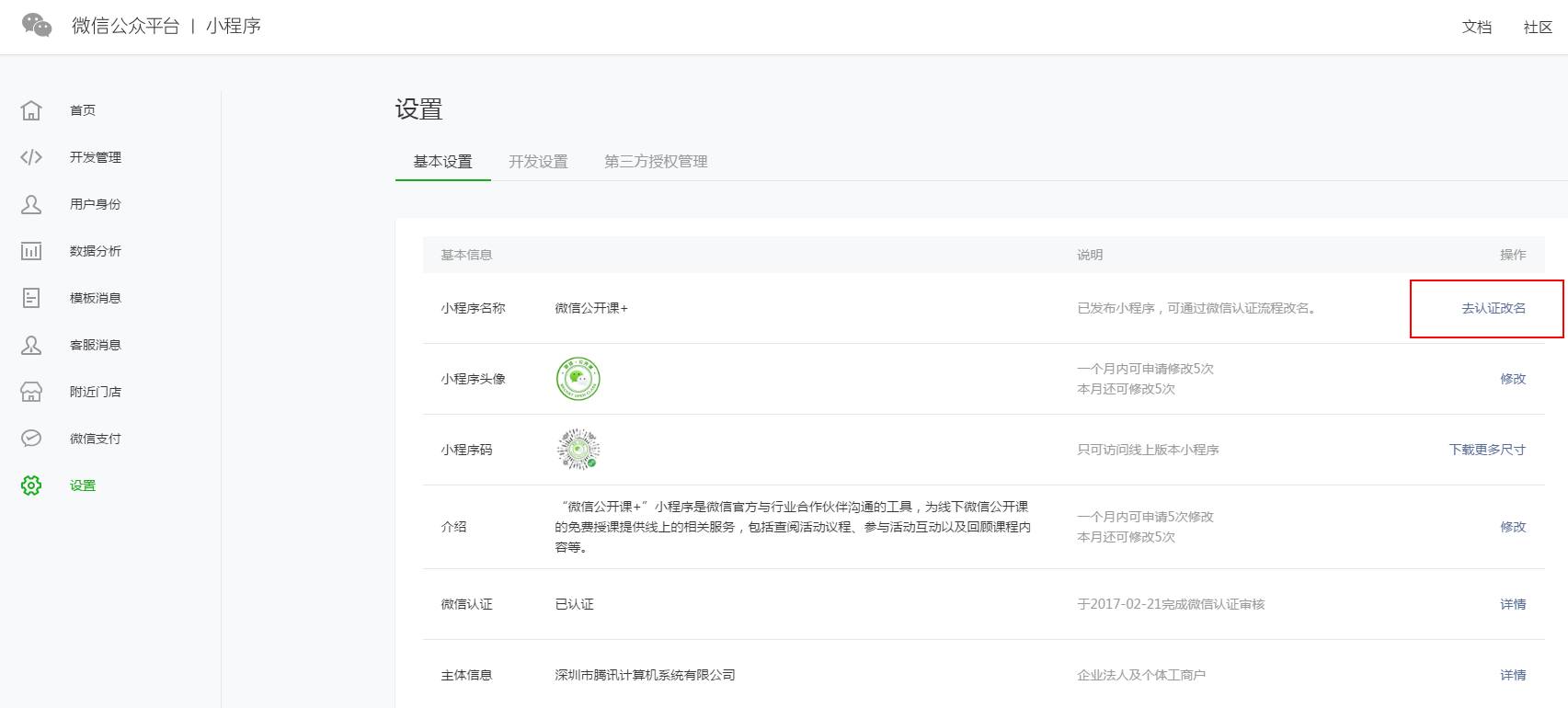注意: 1.未发布的(个人类/组织类)小程序在发布前可改名2次 2.已发布的组织类小程序可通过微信认证的方式改名,已发布的个人类小程序暂不支持改名。